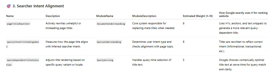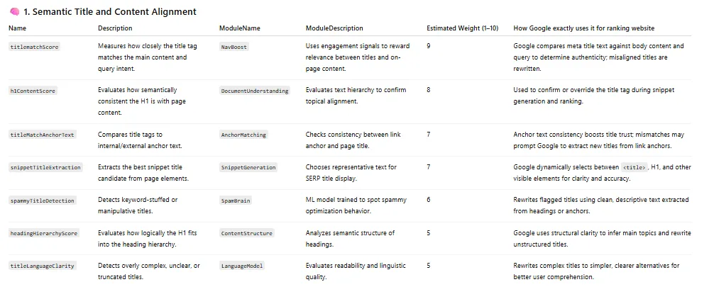 TitlematchScore , h1ContentScore , dan spammyTitleDetection meninjau kualitas dasar judul berdasarkan konten halaman dan maksud kueri. Judul, judul utama, dan versi yang terlalu banyak kata kunci, paling banter, ditulis ulang.