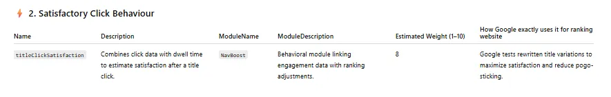 Seperti biasa, klik adalah sinyal yang sangat kuat. Google memiliki lebih banyak titik data daripada makan malam hangat yang pernah saya makan, jadi saya punya gambaran yang cukup bagus tentang apa yang akan berhasil. Namun, klik sungguhan dapat mengalahkan ini. NavboostFactor yang sangat berharga adalah bukti bahwa perilaku klik memengaruhi judul mana yang ditampilkan.